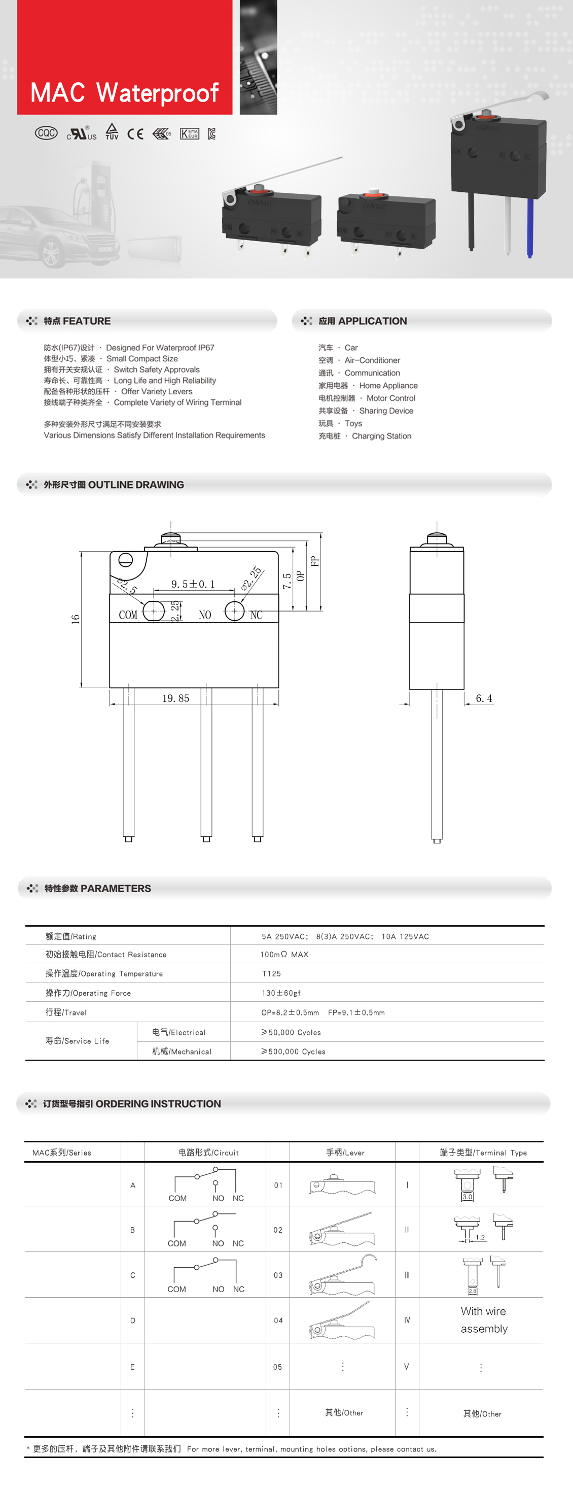 MAC系列 防水微动开关 Ⅰ型外壳 焊线包塑款