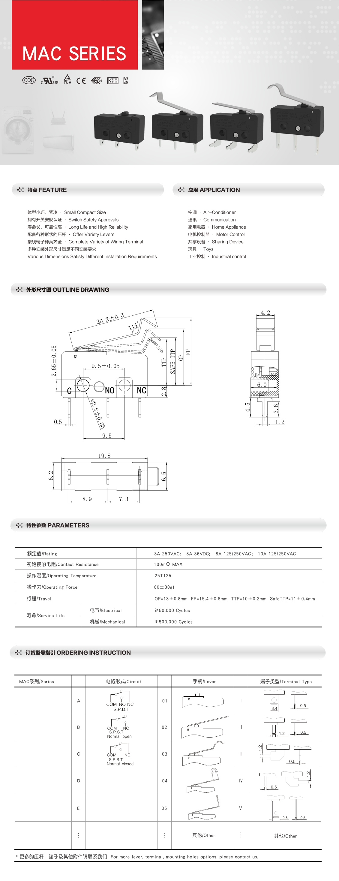 MAC系列 微动开关 长焊线端子脚 多规格压杆