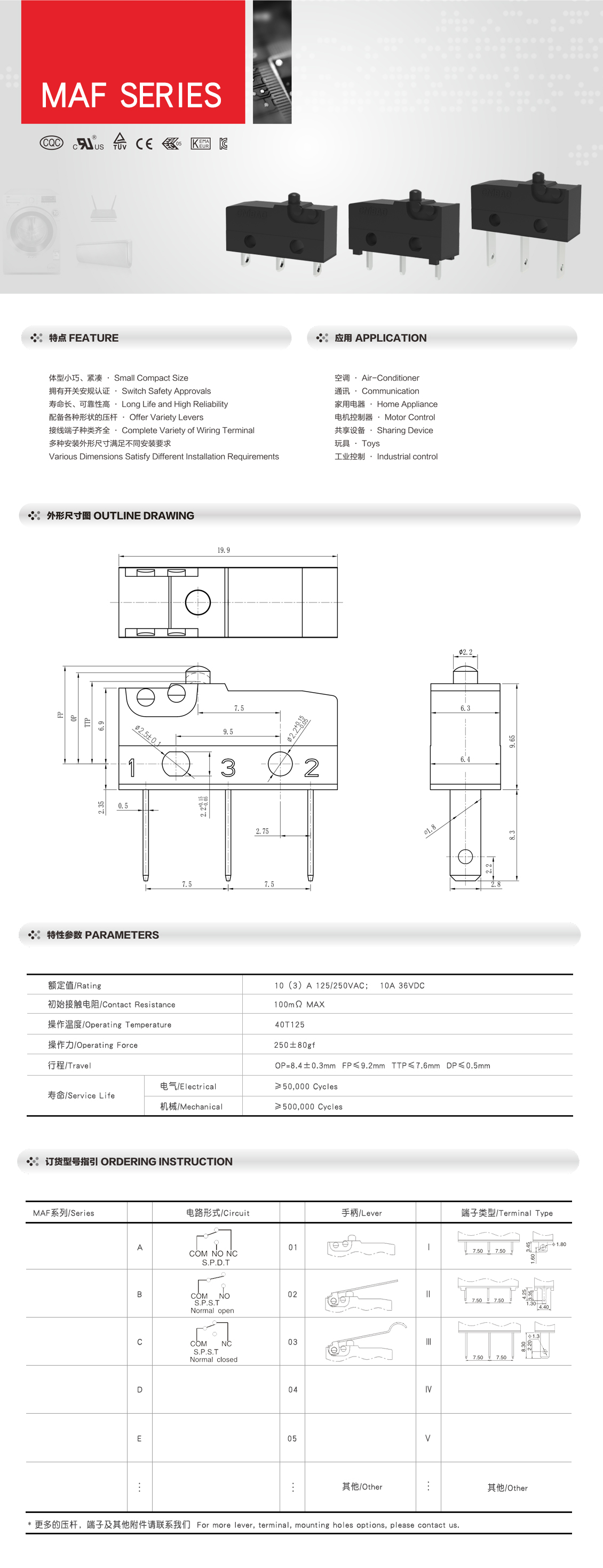 MAF系列 微动开关 短焊线端子脚 多规格压杆