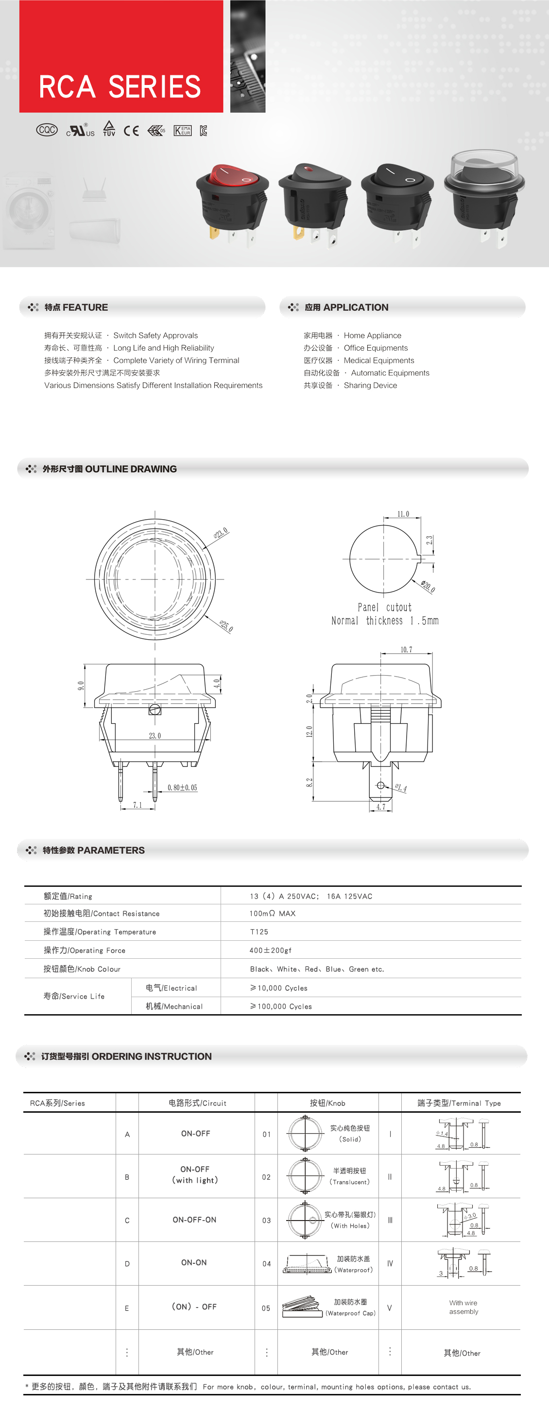 RCA系列 船型开关 圆形翘板开关可带灯 多规格按钮端子